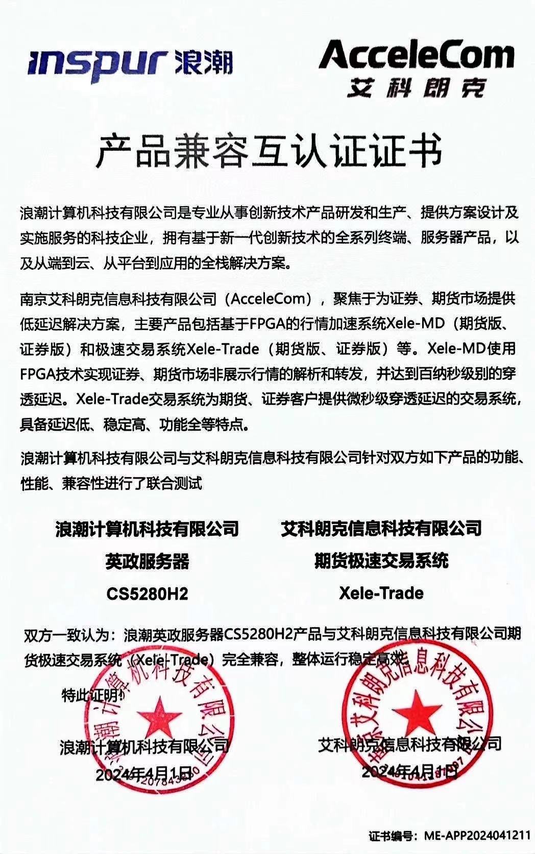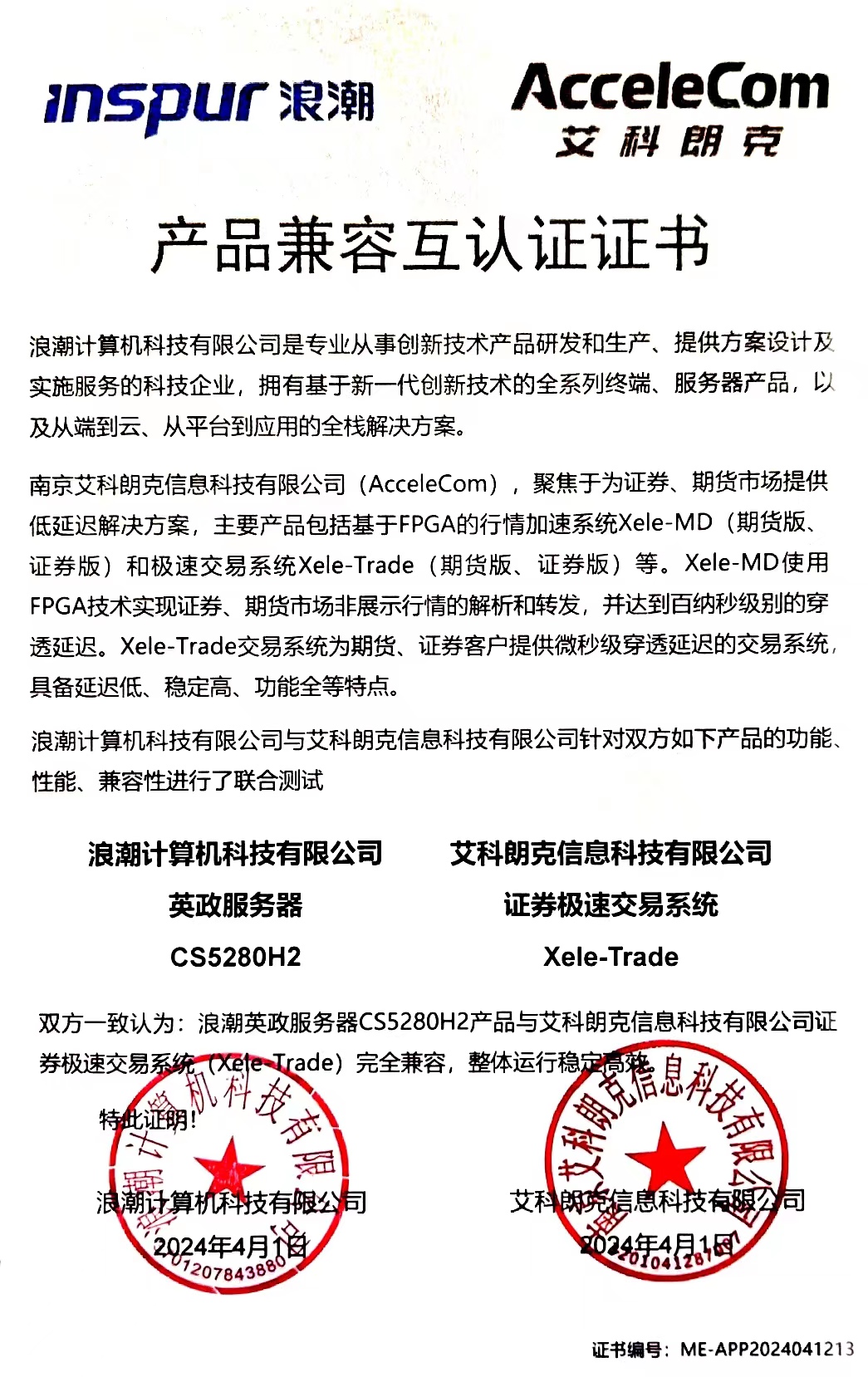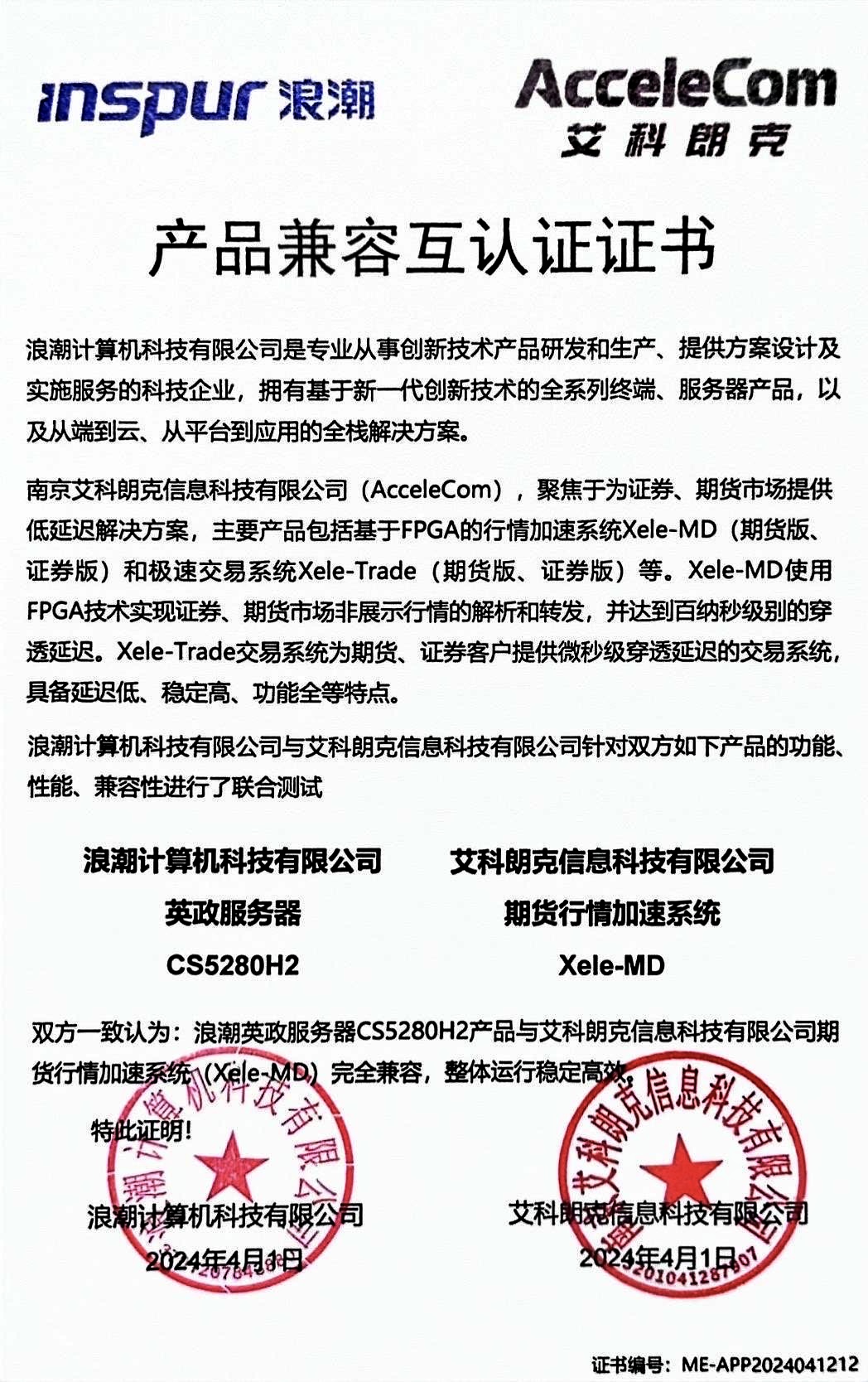 本次联合测试的产品分别是艾科朗克Xele-Trade期货版、Xele-Trade证券版、Xele-MD期货版、Xele-MD证券版和浪潮CS5280H2服务器。